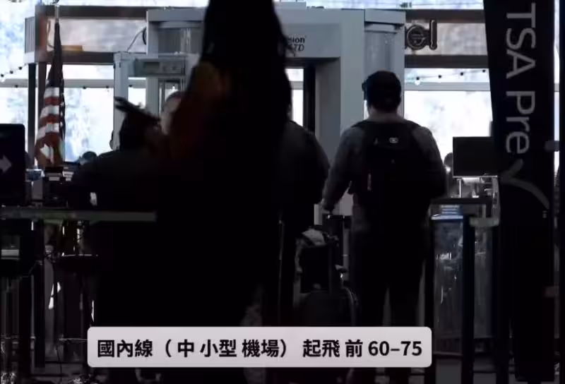 國內線(中小型機場)起飛前60–75分鐘,安檢快速,系統自動化。
