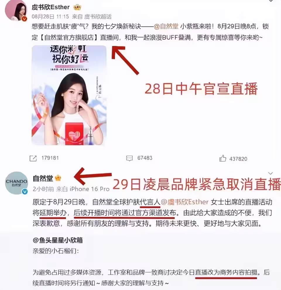 沒說具體原因,但懂的都懂,那時候張昊玥剛爆料霸凌,財經博主的財富爭議也正熱,自然堂是怕直播被網友沖。