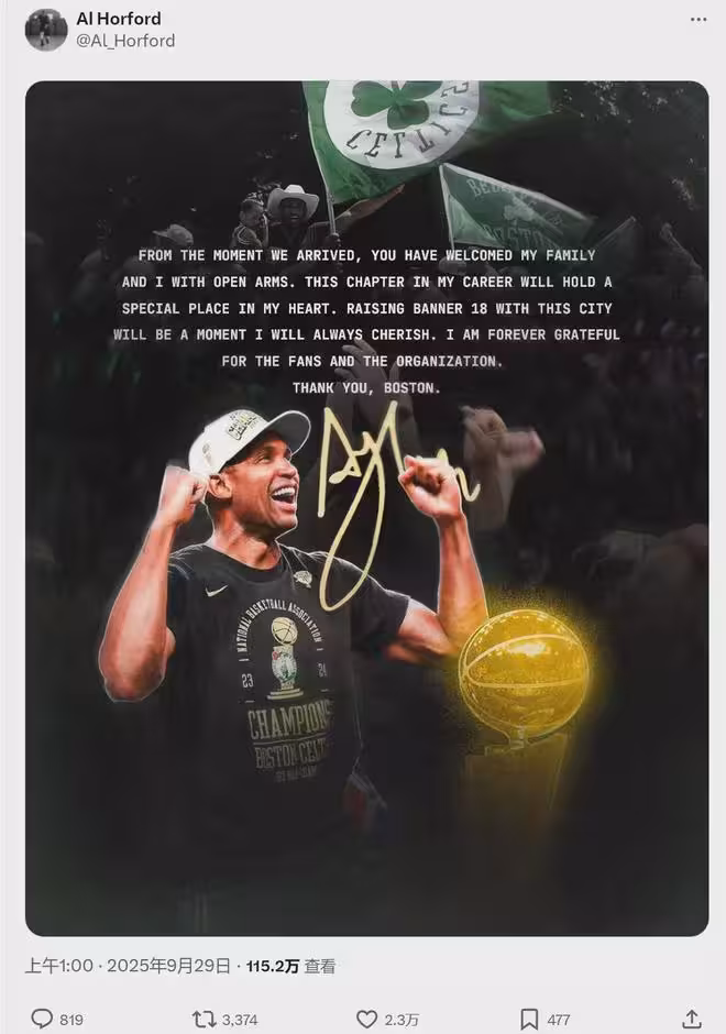 今年7月自由市場開啟之後,勇士就將霍福德列為頭號引援目標。由於第6個孩子即將出生,霍福德一度考慮退役。勇士承諾其「首發中鋒」的位置,最終說服霍福德繼續征戰。塔圖姆說:「本以為能跟霍福德打到他退役,可惜他卻離開了。」