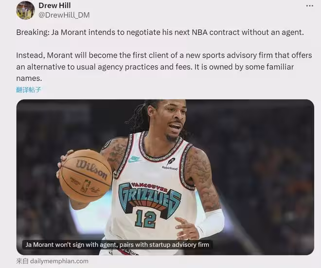 最近一年半,莫蘭特已經兩次炒掉經紀人:1、2024年4月,莫蘭特和經紀人吉姆-坦納解約,吉姆-坦納是莫蘭特在NBA的首個經紀人,雙方自2019年開始合作;2、2025年6月,莫蘭特和邁克-米勒創立的經紀公司Lift Sports解約。