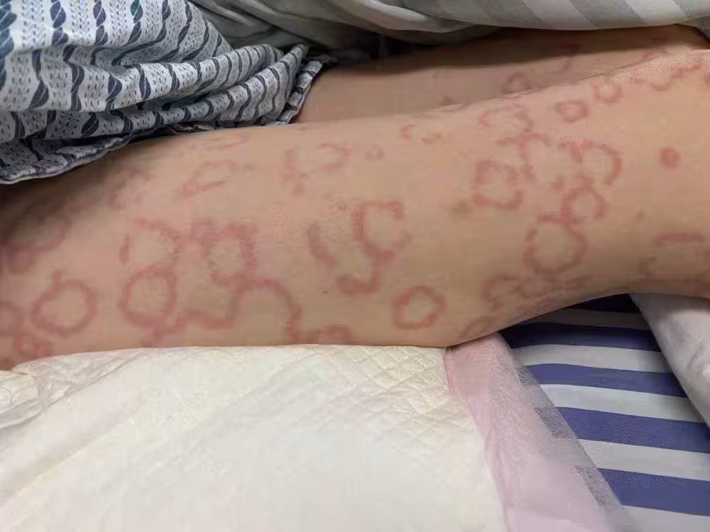 這些紅疹大小如硬幣,中心有個隱約的小點,四周泛著紅暈,整體形態活像一朵朵印在皮膚上的「梅花」,乍一看甚至有種詭異的美感。但它們帶來的卻不是美感,而是劇烈的瘙癢和一陣陣灼熱感。