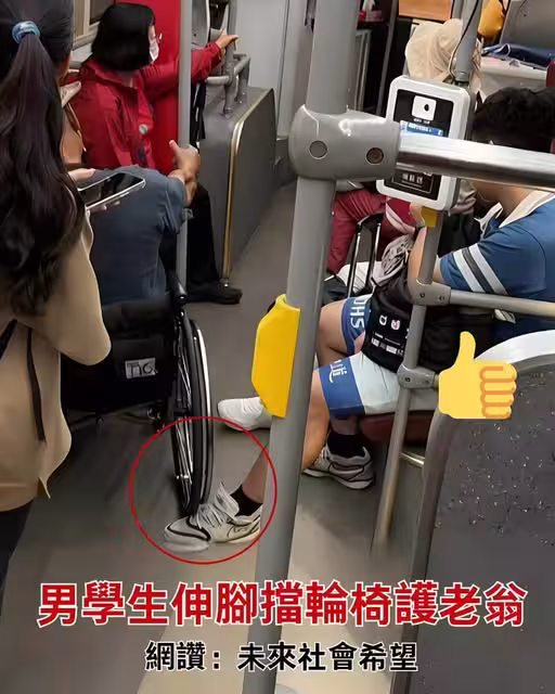 善心的一腳!男學生伸腳擋輪椅護老翁 網贊:未來社會希望