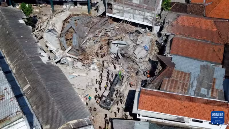 10月4日,救援人員在印度尼西亞東爪哇省詩都阿佐縣的學校建築物倒塌事故現場搜救(無人機照片)。新華社發(薩赫蘭攝)