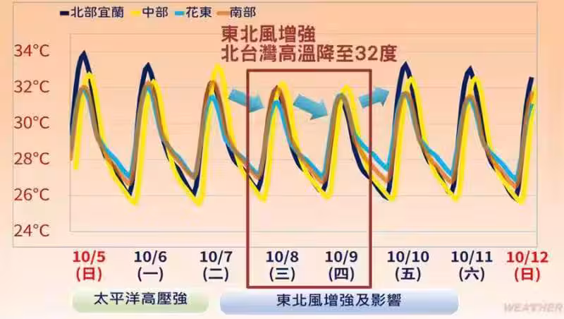 氣象署表示,由於哈隆颱風外圍環境帶來東北風和水汽影響,周三(8)~周五(10)迎風面大台北、基隆北海岸、東半部地區及恆春半島有局部短暫陣雨。