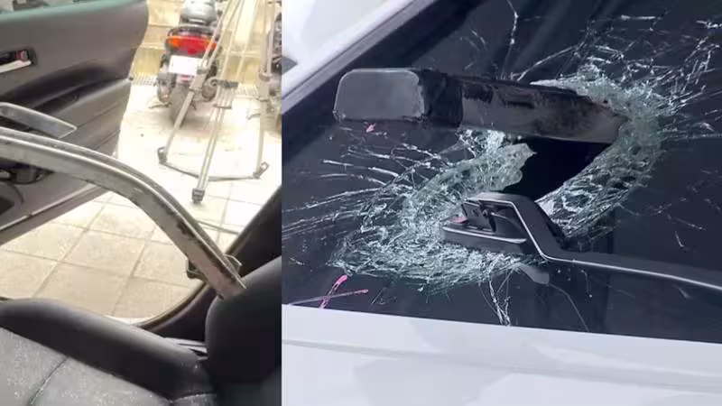 鐵條噴飛砸中車,刺穿擋風玻璃。