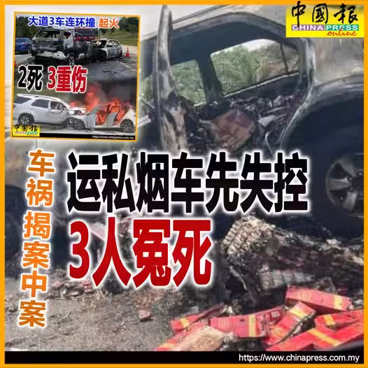 (哥打丁宜11日訊)本地青年駕駛載有走私香煙的休旅車,途中失控沖入反方向車道,與另一輛休旅車相撞後,再與一輛轎車相撞,並在路中間起火燃燒,釀成3死2重傷慘劇。