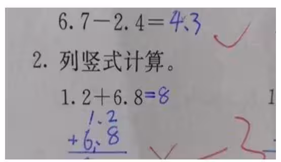 小學生「1.2+6.8=8」被打叉,家長提出質疑網上就有網友曬出了這麼一張照片,自家還在讀小學的孩子,在一次考試中,孩子在算「1.2+6.8」的時候寫了8,但是卻被打叉。