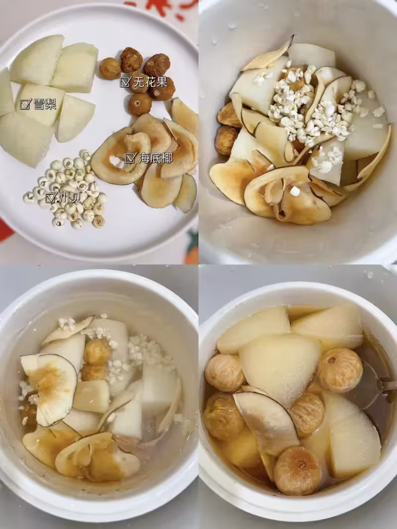 川貝能清熱化痰,是緩解乾咳的好手;雪梨滋潤生津,能有效舒緩喉嚨乾燥;海底椰也有滋陰潤肺的作用。