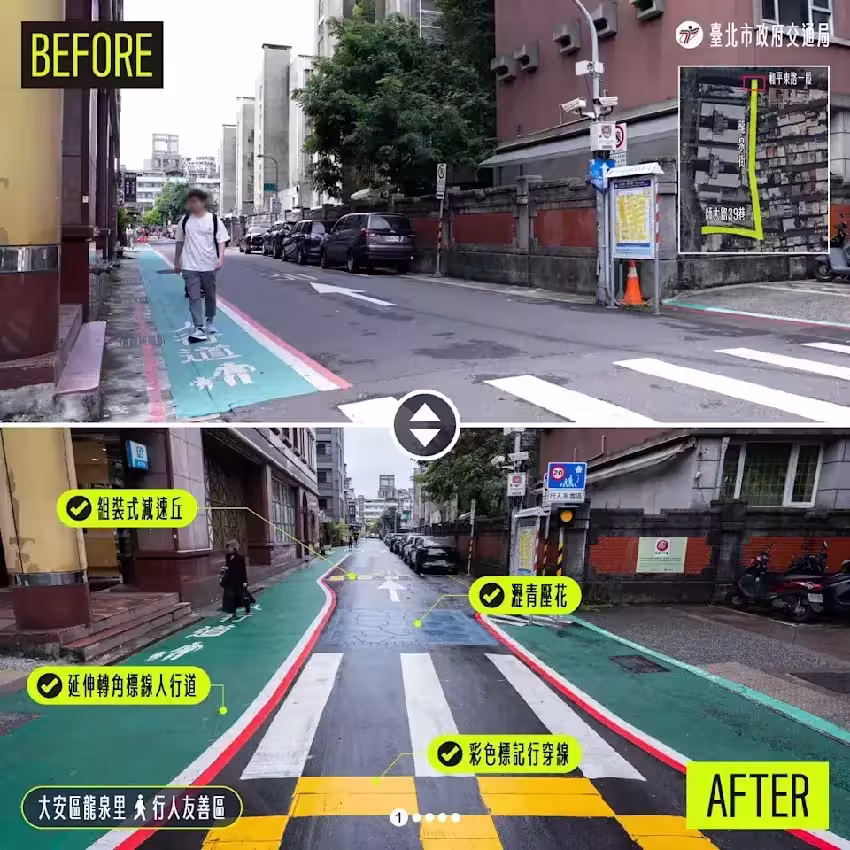 臉書粉專《台北交通大家談》也分享,龍泉街入口已完成示範,藍色鋪面代表減速區,黃色格線則提醒「此處禮讓行人」。