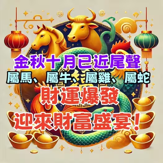 金秋十月已近尾聲,四大生肖——屬馬、屬牛、屬雞、屬蛇,財運亟待爆發!若你恰好屬於其中之一,請務必做好準備,迎接財富的降臨!雖然我們在談論橫財、意外之財,但要牢記——富貴雙全,除了天賜良機,踏實的行動與正確的決策才是關鍵。