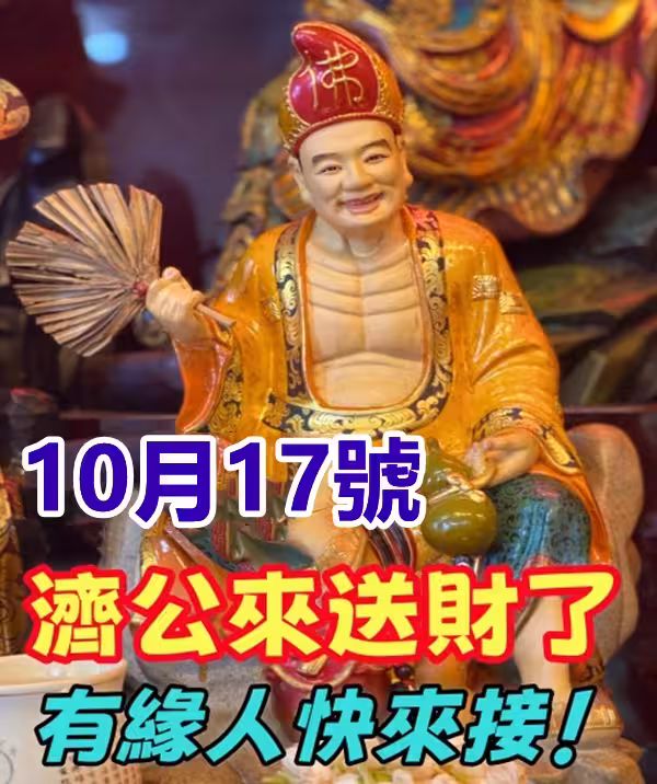 10月17號,這一天特別適合有緣之人把握機緣,因為濟公佛祖來送財了!這位佛教傳說中的濟公,素以慈悲為懷,喜歡幫助有緣人脫離困境,帶來好運與福氣。
