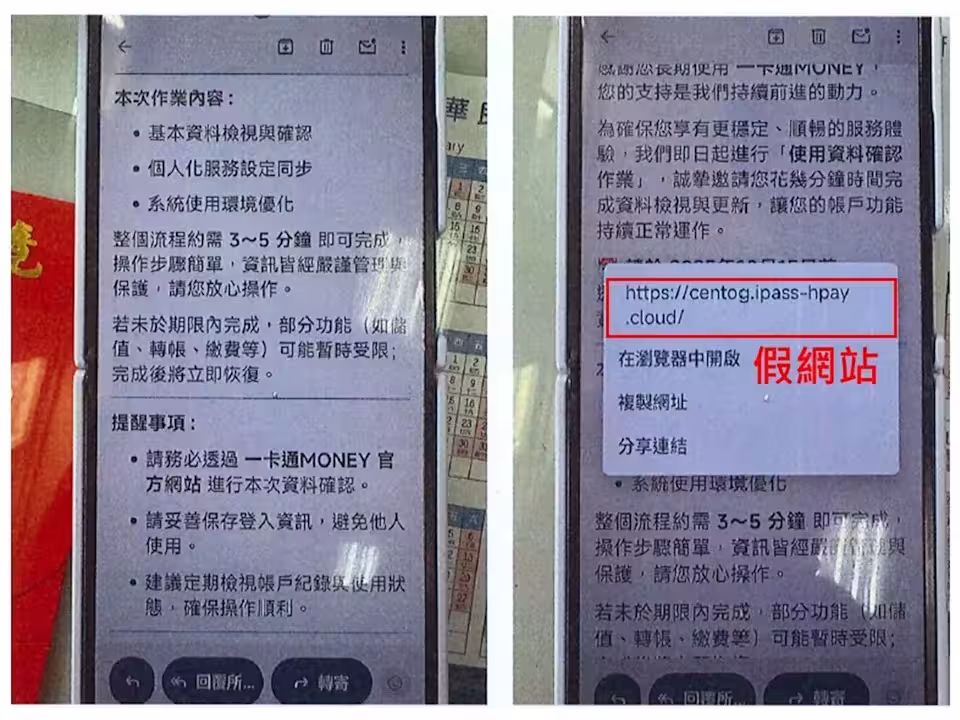 雖然刑事局已協助停止假網站解析,但自10月21日起,詐團又換成「悠遊付」名義,以同樣手法發送釣魚信與簡訊,謊稱「更新帳戶」、「儲值回饋」,要求輸入個資、密碼、手機號與OTP驗證碼,目前已陸續有被害人報案。