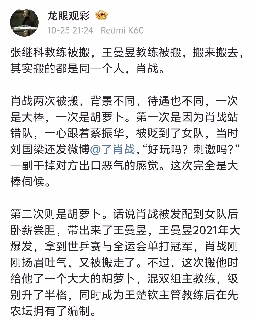 賀曉龍認為肖戰只要離開一名球員,這名球員的職業生涯走向就很成問題了,他確實是一個風向標。他還表示肖戰經常酒後吐真言,我本是梟雄,奈何成棋子。肖戰以前訓練弟子都非常嚴格,弟子經常出現傷病的問題。自從成為王楚欽的主管教練之後,他就從嚴父變成了慈父。