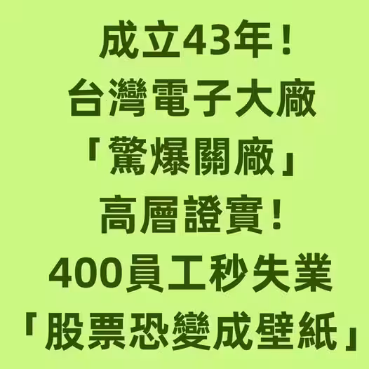 成立43年!台灣電子大廠「驚爆關廠」高層證實!400員工秒失業「股票恐變成壁紙!」