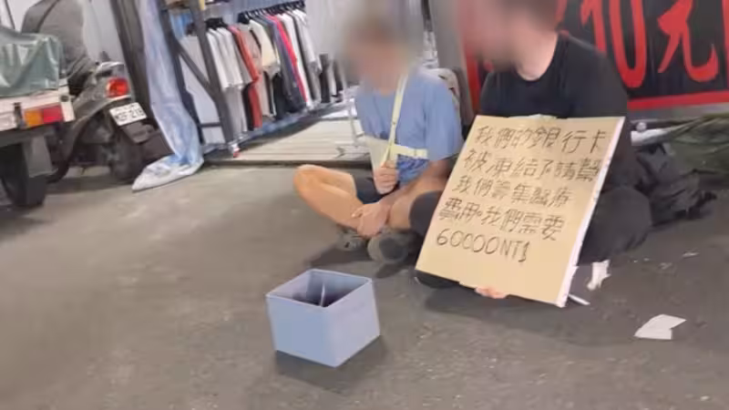 台中一中街有2名外國男子,坐在地上擺出紙板寫著「銀行卡被凍結,需要募集醫療費用6萬元」。