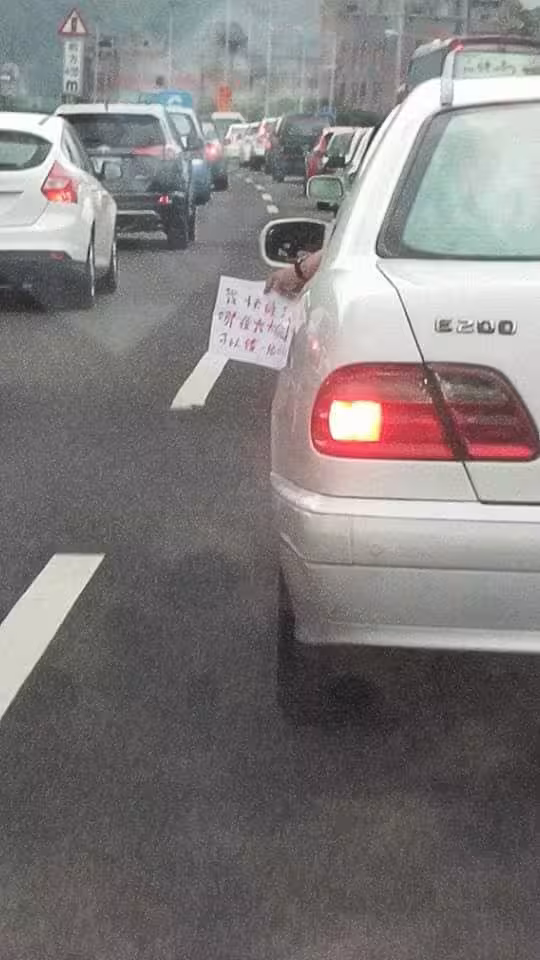 據《TVBS》報導,一位網友在爆笑公社上分享,假期間他行經國道五號頭城路段時,卡在長長的車陣中塞車塞到爆,這時就見到前方的汽車駕駛,疑似因為快睡著,突發奇想手拿一張A4紙伸出窗外,上面紅色字體寫著:「我快睡了,哪位大大有煙,可以借一根嗎?」不過原PO透露,這位駕駛舉了半小時都沒人理,只見照片中的手一下舉高,一下又靠著窗邊,急需一根提神,讓他哭笑不得的說:「有哪位好心人就分他一根吧!」