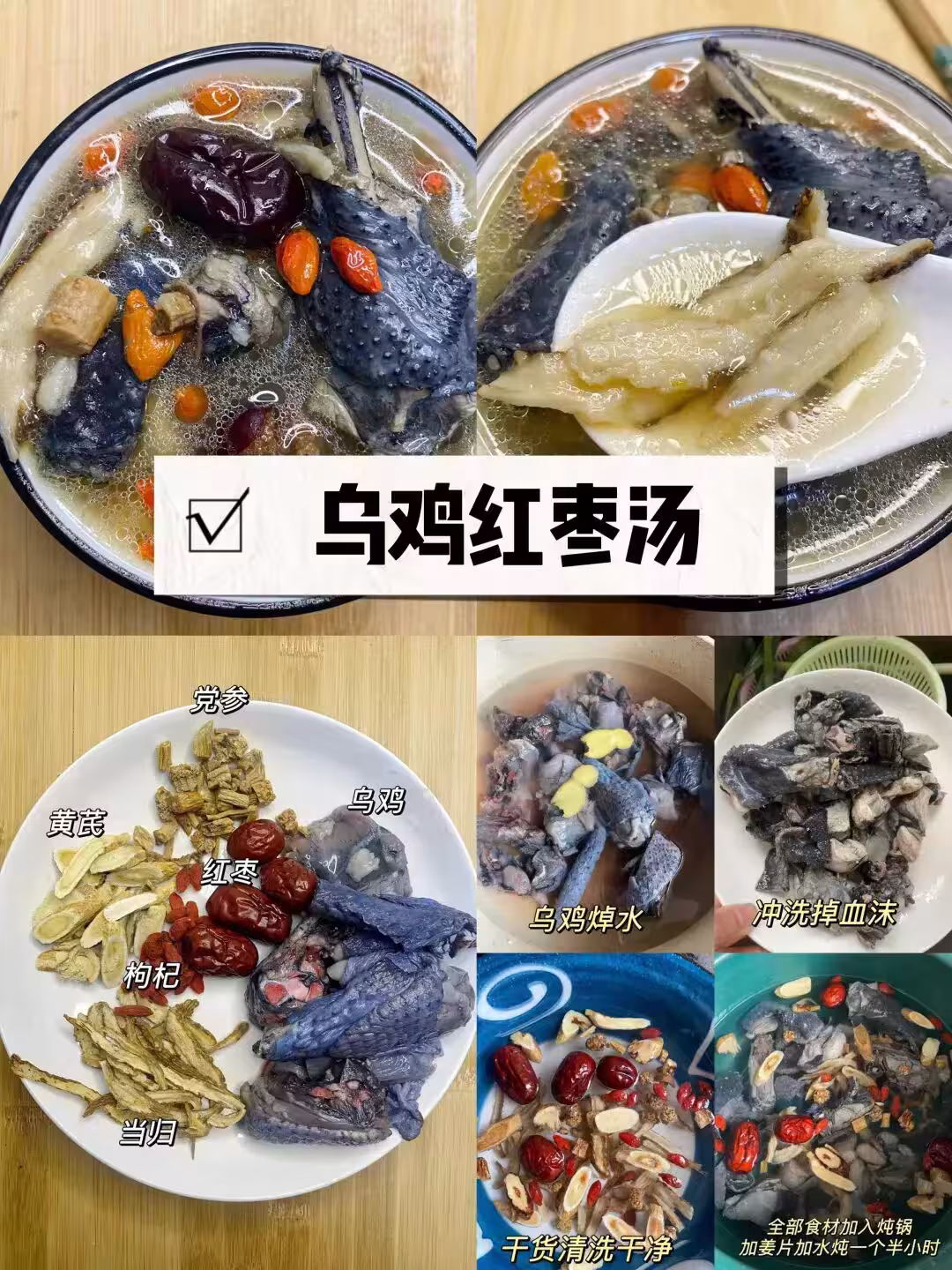 食材準備: 黨參 黃芪 烏雞 紅棗 枸杞 當歸 製作步驟: 烏雞焯水 沖洗掉血沫 乾貨清洗乾淨 全部食材加入燉鍋 加薑片加水燉一個半小時