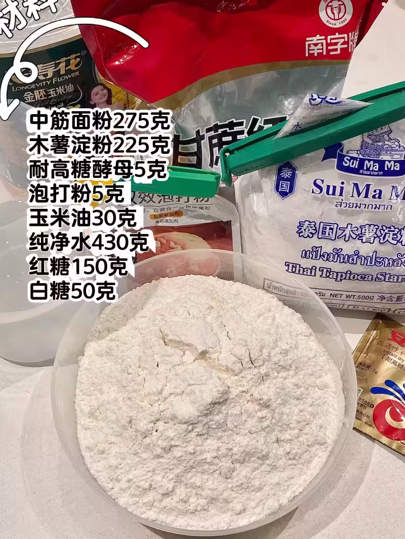 2️⃣麵粉木薯澱粉加入紅糖水攪勻過篩,密封常溫發酵至兩倍大,一小時左右