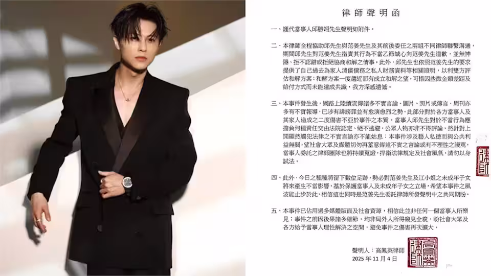 男星范姜彥豐近日拍片證實婚變傳聞,指控粿粿與男星王子(邱勝翊)有不正當男女關係,事件曝光後,王子承認「關係超出朋友界線」,昨(4日)晚間王子發布新聲明再次道歉。