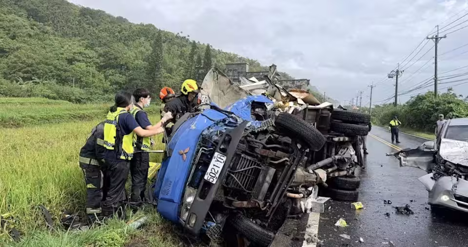 花蓮地區受鳳凰颱風外圍環流影響,12日上午間歇降下大雨濕滑的道路也釀成悲劇,上午約9時許,台11線約40公里處豐濱路段發生一起嚴重車禍,1輛大型拖板吊車疑似在過彎時因路面濕滑、剎車不及,車尾猛烈甩出,正好掃中對向行駛的1輛小貨車。