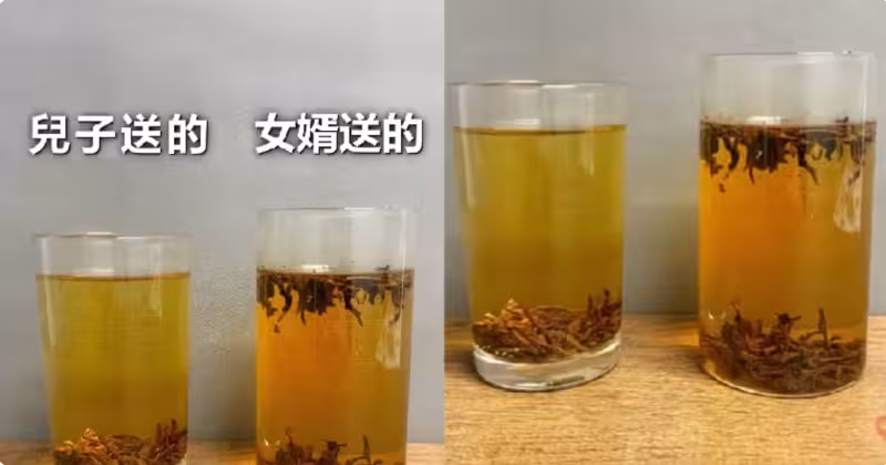 這位網友還補充說,兒子送的茶湯色清亮,茶葉沉底,顯示出其品質上乘;而女婿送的茶湯色混濁,茶葉漂浮,可能品質不如兒子送的。