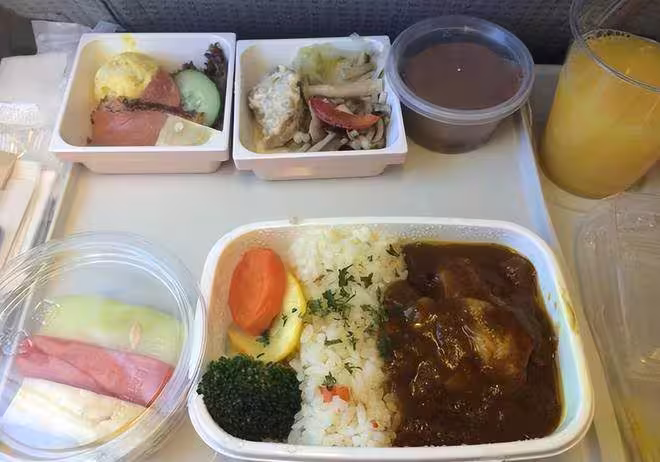 至於這飛機餐的內容,一般都是主食、配菜和飲料,均衡搭配,像是什麼牛肉飯、雞肉飯、麵條、橙汁、咖啡、茶水等等。