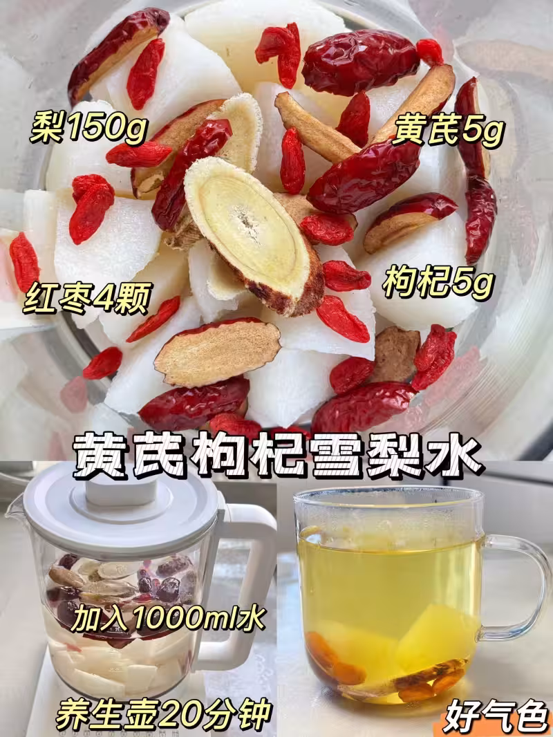 金銀花菊花雪梨水:梨 150g+金銀花 5g+大菊花兩朵+水 1000ml