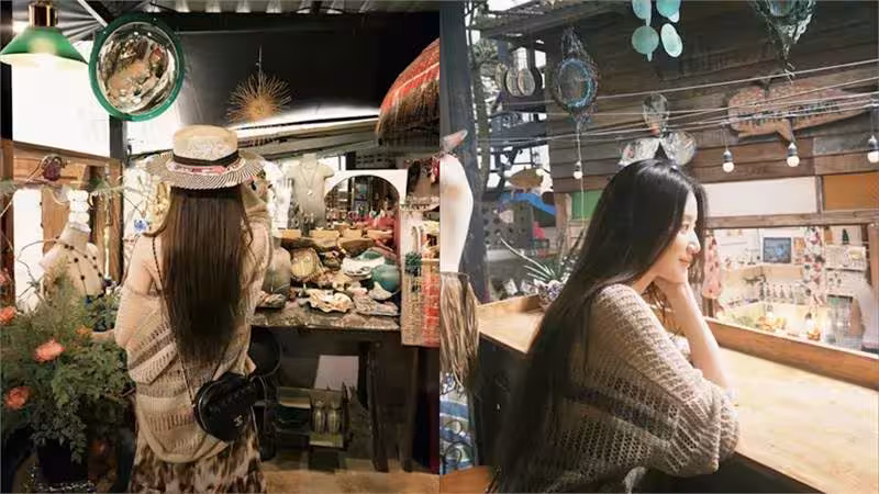 無論是背對鏡頭逛攤位,還是低頭挑選飾品,都宛如從電影中走出來的文青女主角,一頭黑長直發垂落而下,柔和氛圍感滿分。
