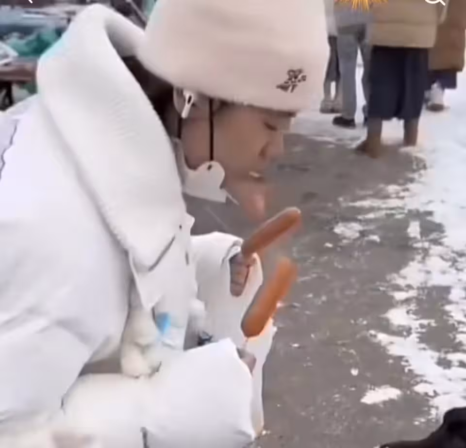 全紅嬋也愛吃烤腸!冰天雪地吃得津津有味,咬下一塊吐地上,喂給狗吃