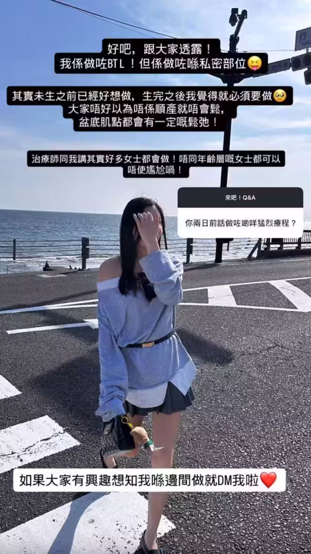 對此陳詩欣表示:其實未生之前已經好想做,生完之後我覺得就必須要做,大家不要以為不是順產就不會松,盆底肌怎麼樣都會有一定的鬆弛,治療師和我講很多女士都有做,不同年齡層的女士都可以,不用尷尬的。