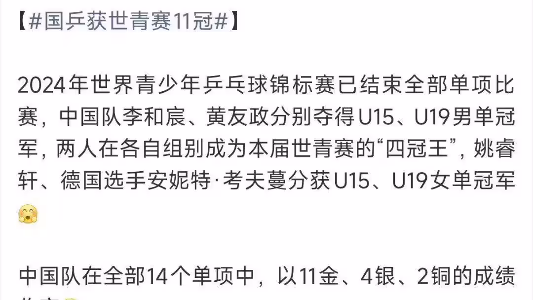 在U15組別,中國隊斬獲三冠,男單決賽由於海洋與周冠宏內戰,于海洋以4-2奪冠;男雙組合于海洋/周冠宏以3-0乾淨利落擊敗土耳其組合奧卡爾/卡赫拉曼;女雙祝啟慧/劉子菱以3-1力克日本對手村松心菜/石田心美成功奪冠。然而祝啟慧女單遺憾獲得亞軍,4-2不敵德國高手坂垣心春,混雙也惜敗泰國組合,獲得亞軍。兩項團體比賽中,中國隊分別獲得男團和女團銅牌,男團遭遇強勁中國台北隊淘汰,女團則輸給實力提升顯著的日本隊。如今境外競爭加劇,國乒優勢明顯減弱,比賽過程格外艱難。