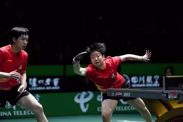 11月30日,中國隊選手王楚欽/孫穎莎(右)在混雙比賽中。最終,他們3比0戰勝中國香港隊選手黃鎮廷/杜凱琹。 當日,在四川成都舉行的2025年國際乒聯混合團體世界盃第一階段A組小組賽中,中國隊總比分8比1戰勝中國香港隊。 新華社記者 王迎 攝