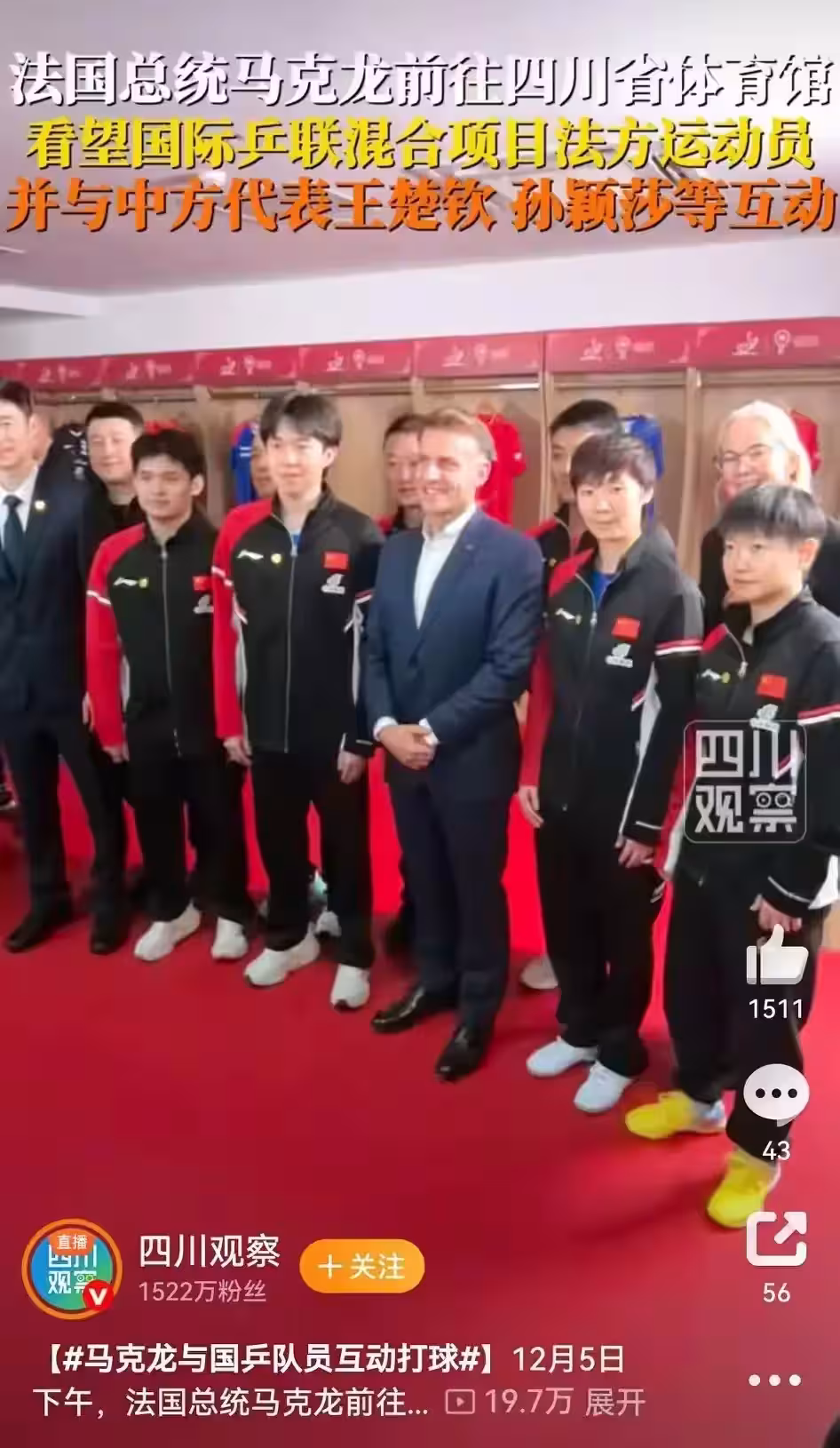 法國總統馬克龍這次訪華有個特別安排——專程到成都和國乒冠軍們打桌球!這場「總統級」友誼賽亮點十足,讓中外網友直呼「太會玩了」。
