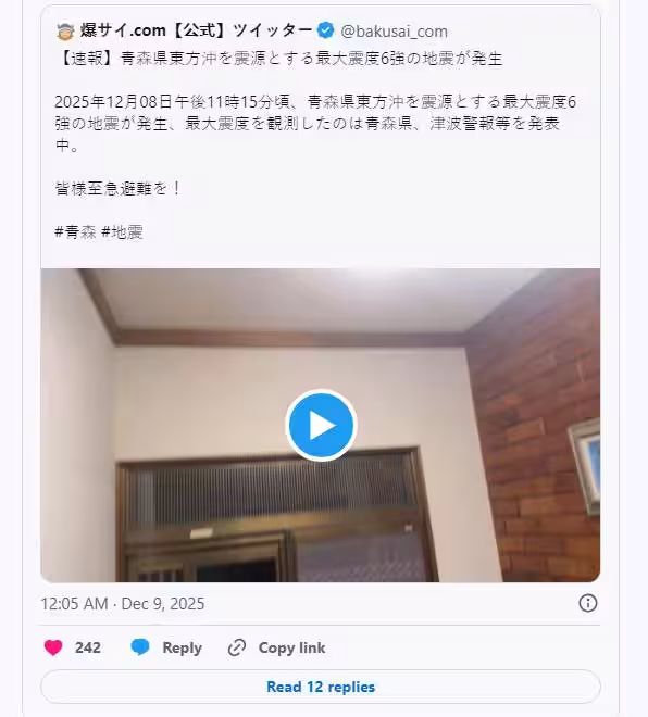 快訊/日本又震了!「規模7.6強震」玻璃門爆裂,超4千戶停電, 傷亡狀況曝