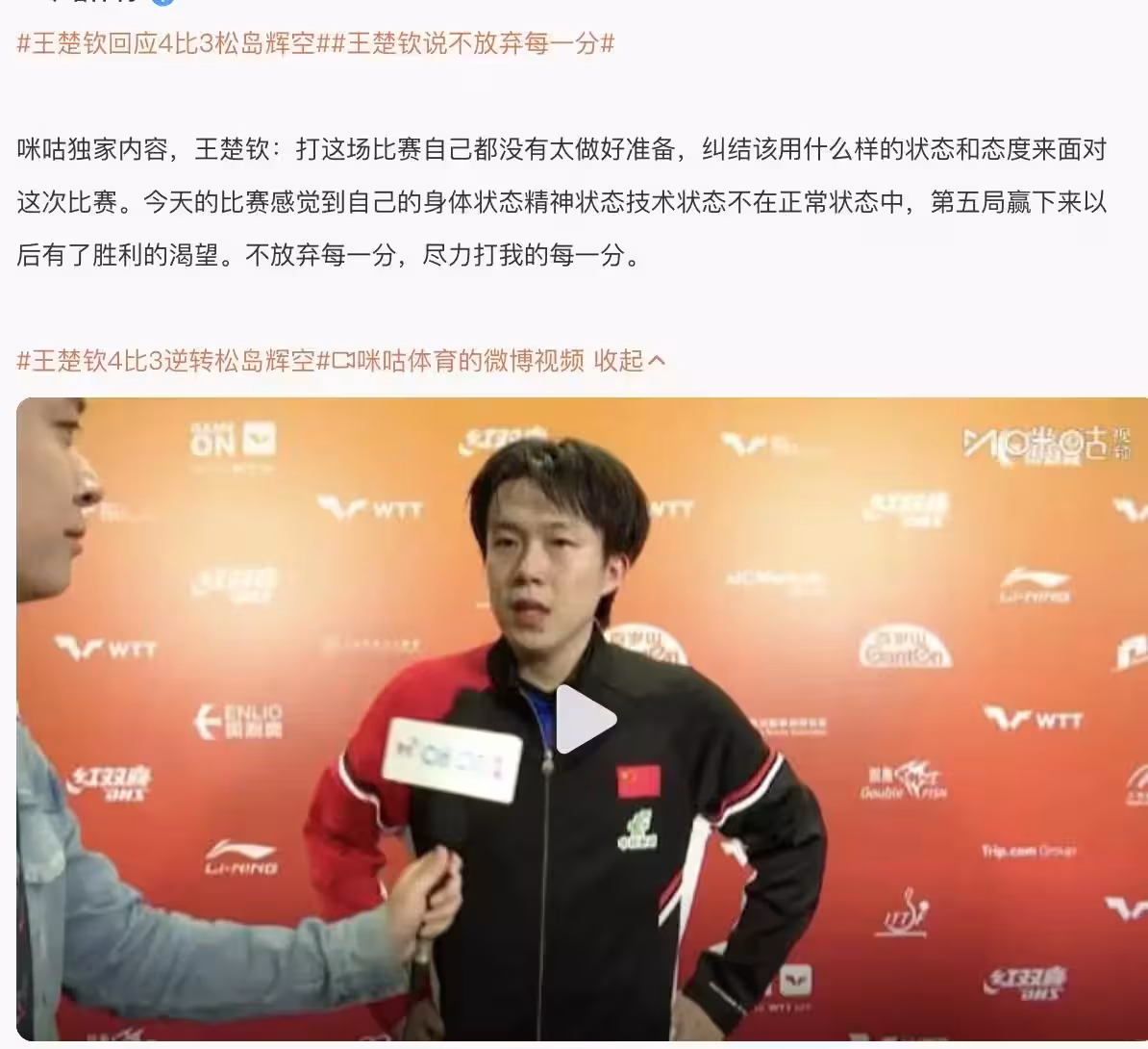 心疼王楚欽,4 : 3大逆轉松島輝空後氣喘吁吁,2個細節讓球迷淚目