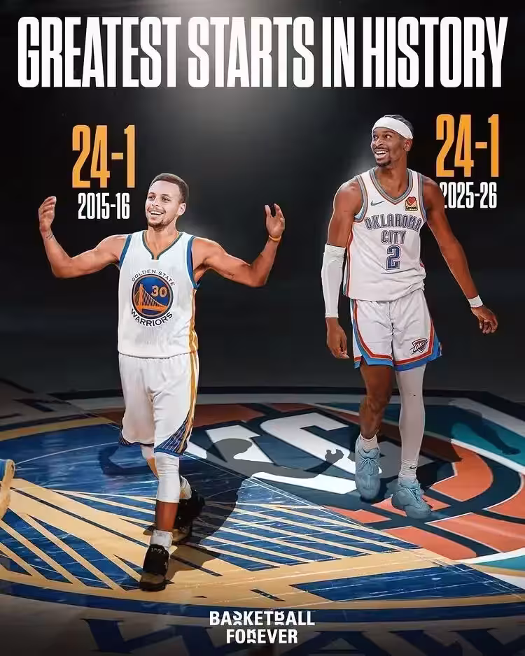 2021-22賽季,雷霆常規賽戰績只有24勝58負。短短四年,西部魚腩變成了聯盟老大。開季前25場比賽,雷霆總凈勝分達到了439分,高居NBA歷史第一。歷史第二是1966-67賽季的凱爾特人380分,第三是2016-17賽季勇士375分。