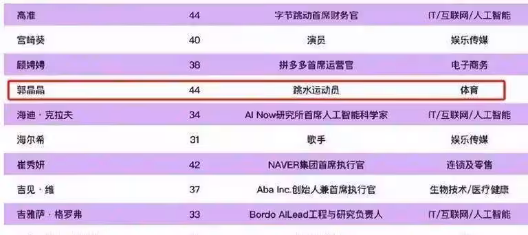 前幾天,郭晶晶入選亞太地區最具影響力青年女性榜單,成為體育領域唯一獲此榮譽的華人代表。