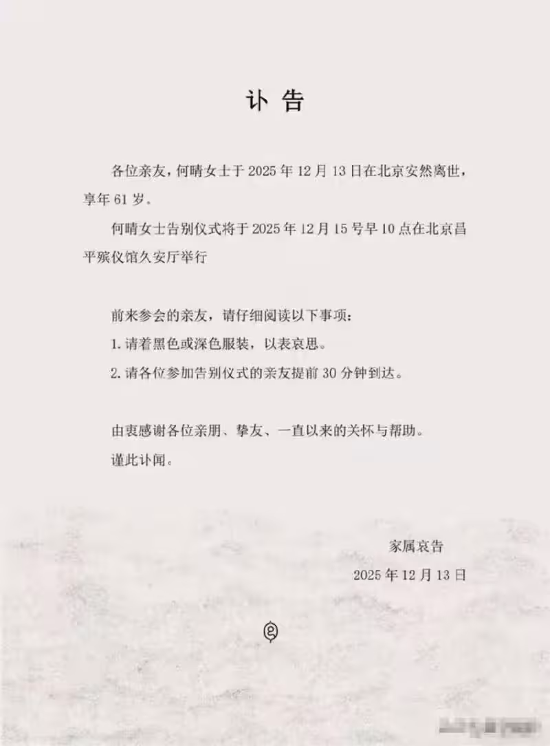 12月13日,一份家屬釋出訃告顯示,著名演員何晴在北京安然離世,享年61歲。
