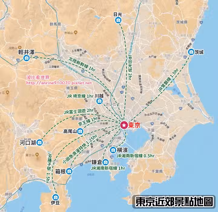 這張東京近郊景點地圖一目了然超清楚,最熱門的東京附近景點&最快速交通方式都列在裡面啦!