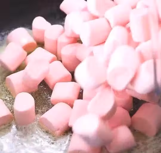 然後加入300g草莓棉花糖,由於我做的是雙色牛乳派,所以會用到兩款棉花糖。