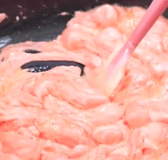 將棉花糖攪拌至溶解一半的程度,準備加下一步材料,注意千萬不要等棉花糖完全化開了,這樣最後口感會很硬。