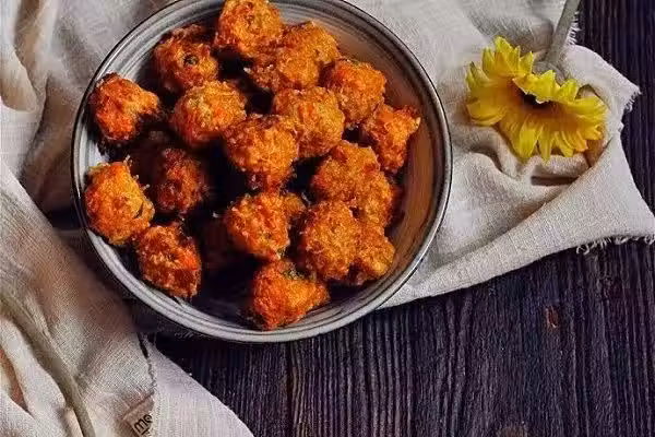 6、放入弄成球的丸子炸到表面金黃色即可!中小火炸