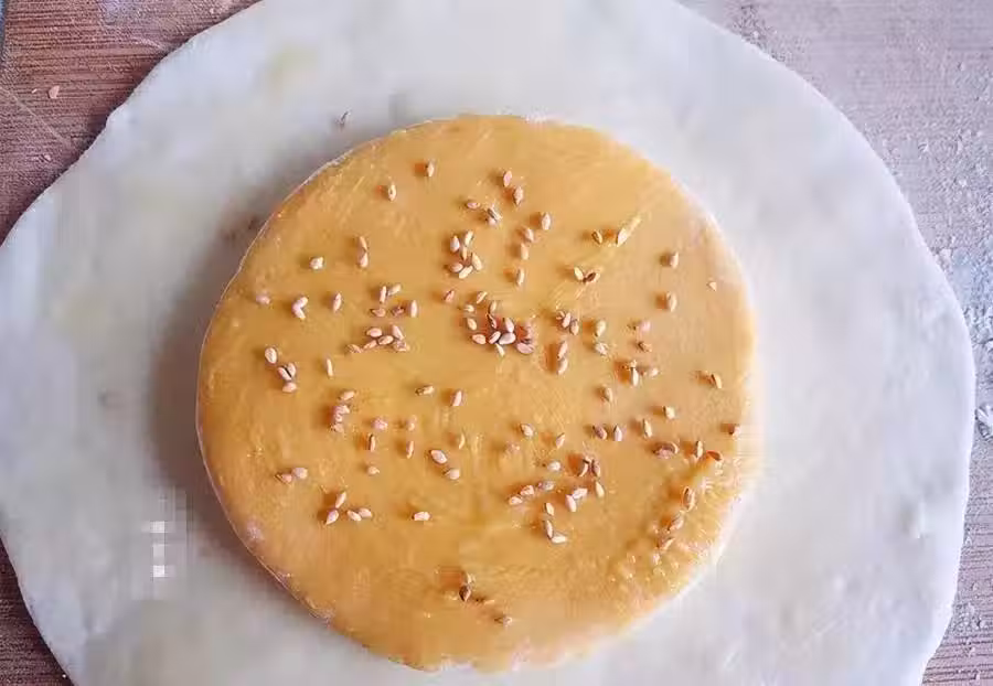 8、 將最後一份黃色麵團擀成和底部白色一樣薄且稍大一點的片,蓋在上面。將薄的黃色面片和薄的白色面片捏緊。