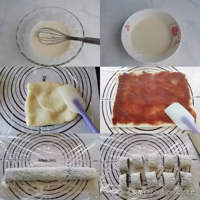 5.利用保鮮膜把面片從一頭捲起,卷好後再撒一些椰蓉在旁邊,讓糯米卷均勻的裹上椰蓉。