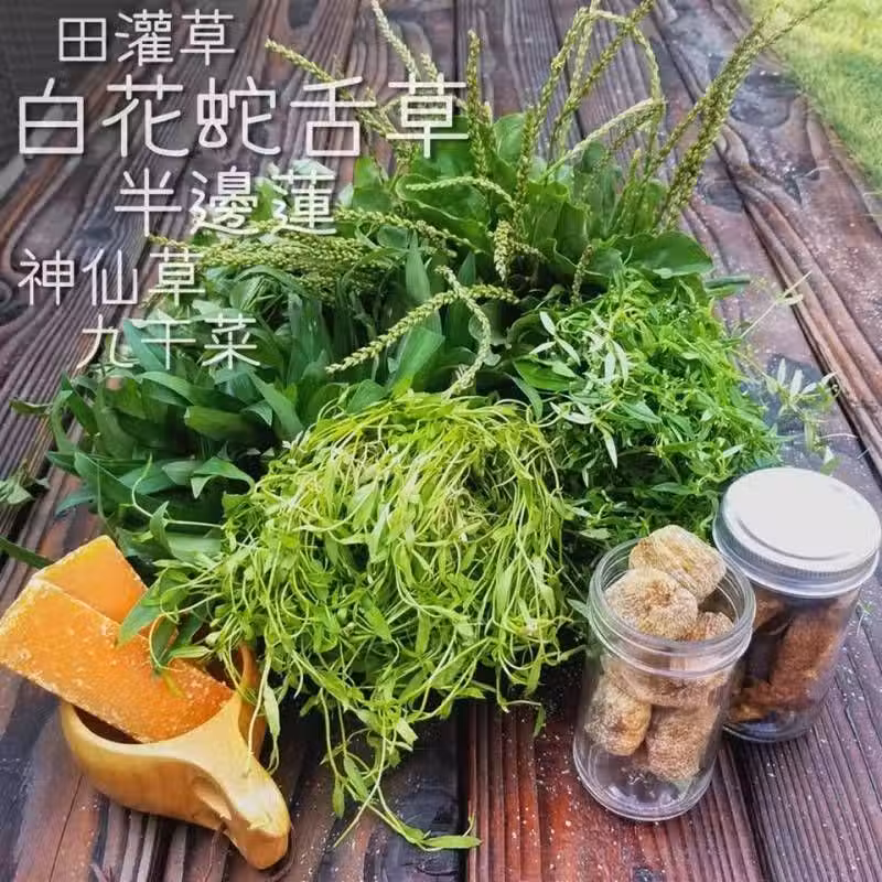 白花蛇舌草、半邊蓮、田灌草、神仙草、九乾菜配蜜棗、果皮、片糖