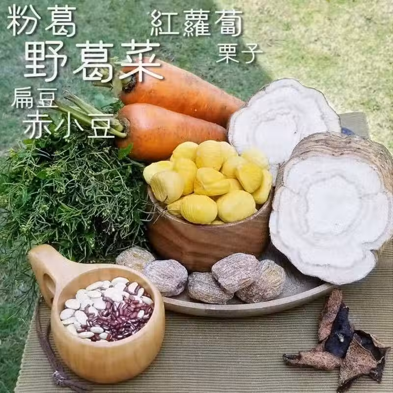 野葛菜、粉葛、紅蘿蔔、栗子、赤小豆、扁豆配蜜棗、果皮