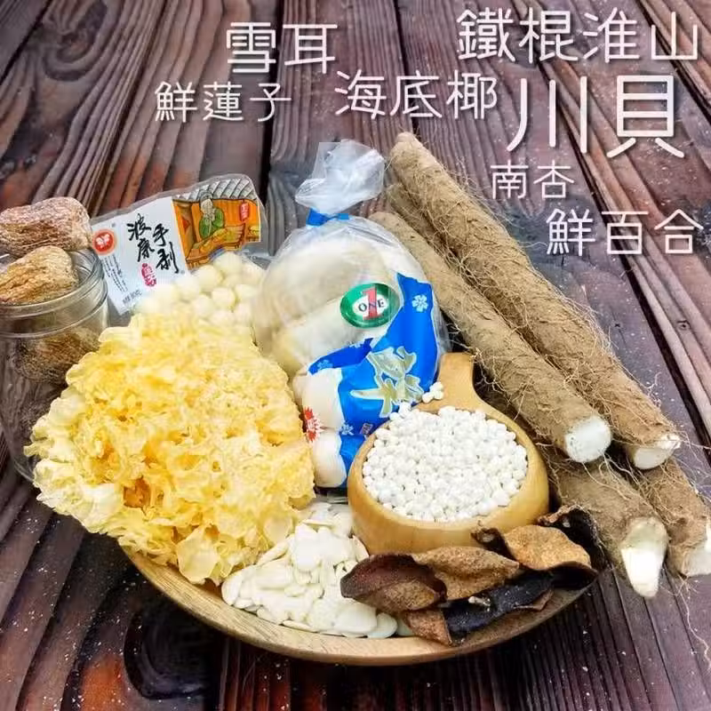 川貝、鐵棍淮山、鮮百合、泰國海底椰、鮮蓮子、雪耳、南杏配蜜棗、果皮