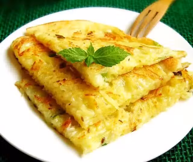 6 翻轉一面,繼續加熱3分鐘,土豆餅金黃熟透就可以了。