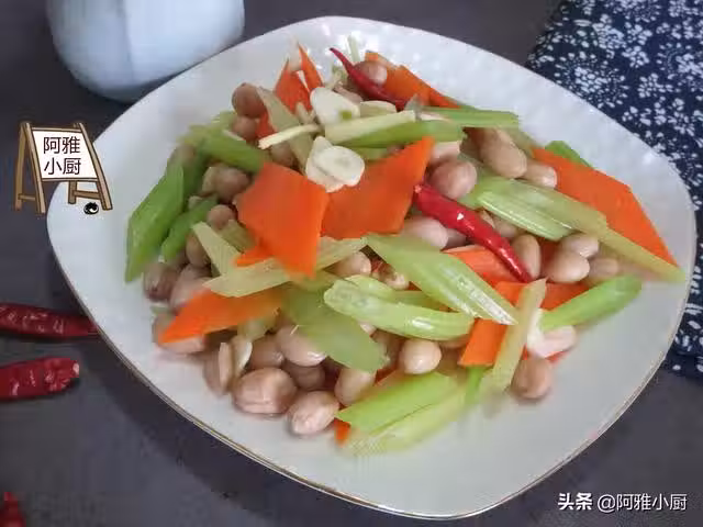 食材:芹菜、胡蘿蔔、花生米、蒜、姜、辣椒、生抽、老抽、鹽、香油、八角