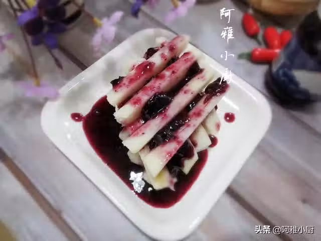 製作步驟:山藥去皮,切成粗細均勻的小段,上鍋蒸熟,蒸熟後擺盤,晾涼後淋上藍莓醬,藍莓山藥就做好了。